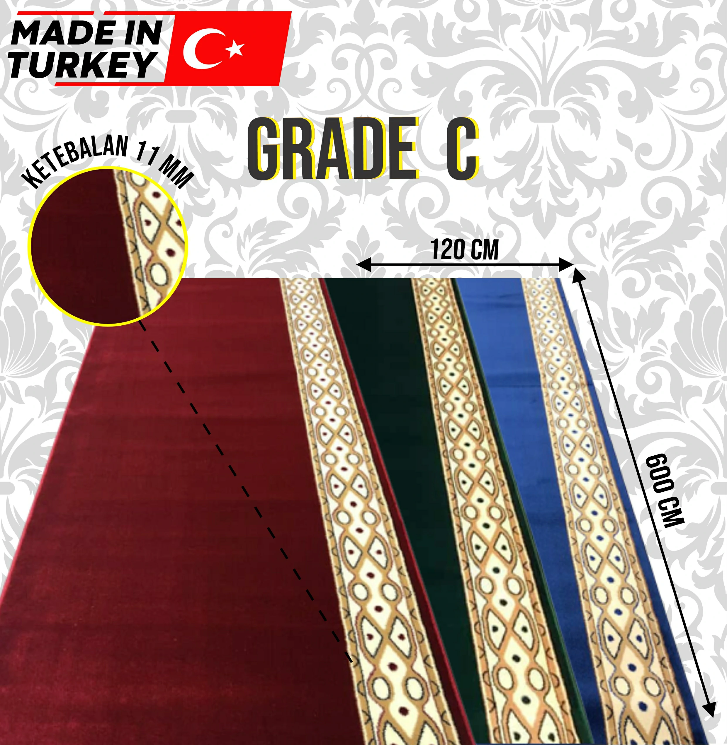 Karpet Masjid Turkey Grade C merupakan karpet produk dengan harga terjangkau dengan kualitas yang kompetitif. Karpet memiliki ketebalan 12mm, lebar per shaff 120cm dan panjang per roll 6m dan 30m yang bisa disesuaikan untuk pemasangan karpet masjid baik skala kecil maupun besar.